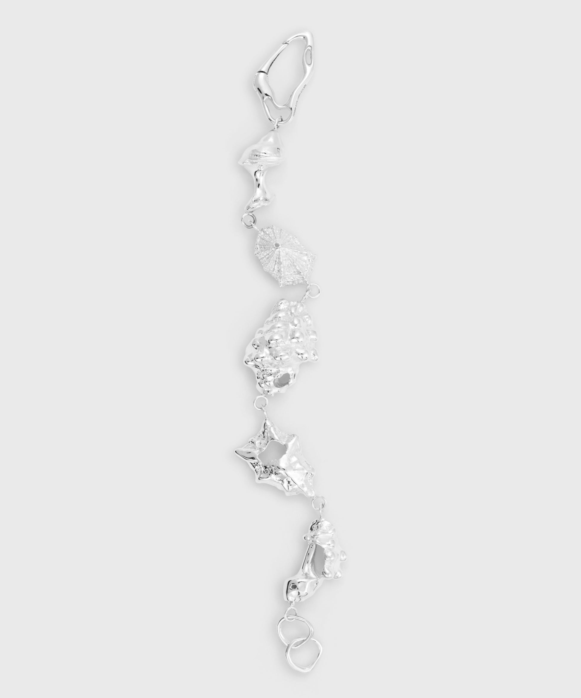 Five different shells found on Jeju Island, South Korea are cast and linked together to form a chain, clasped together with a mini octi clip. Capturing a part of nature into a wearable object.