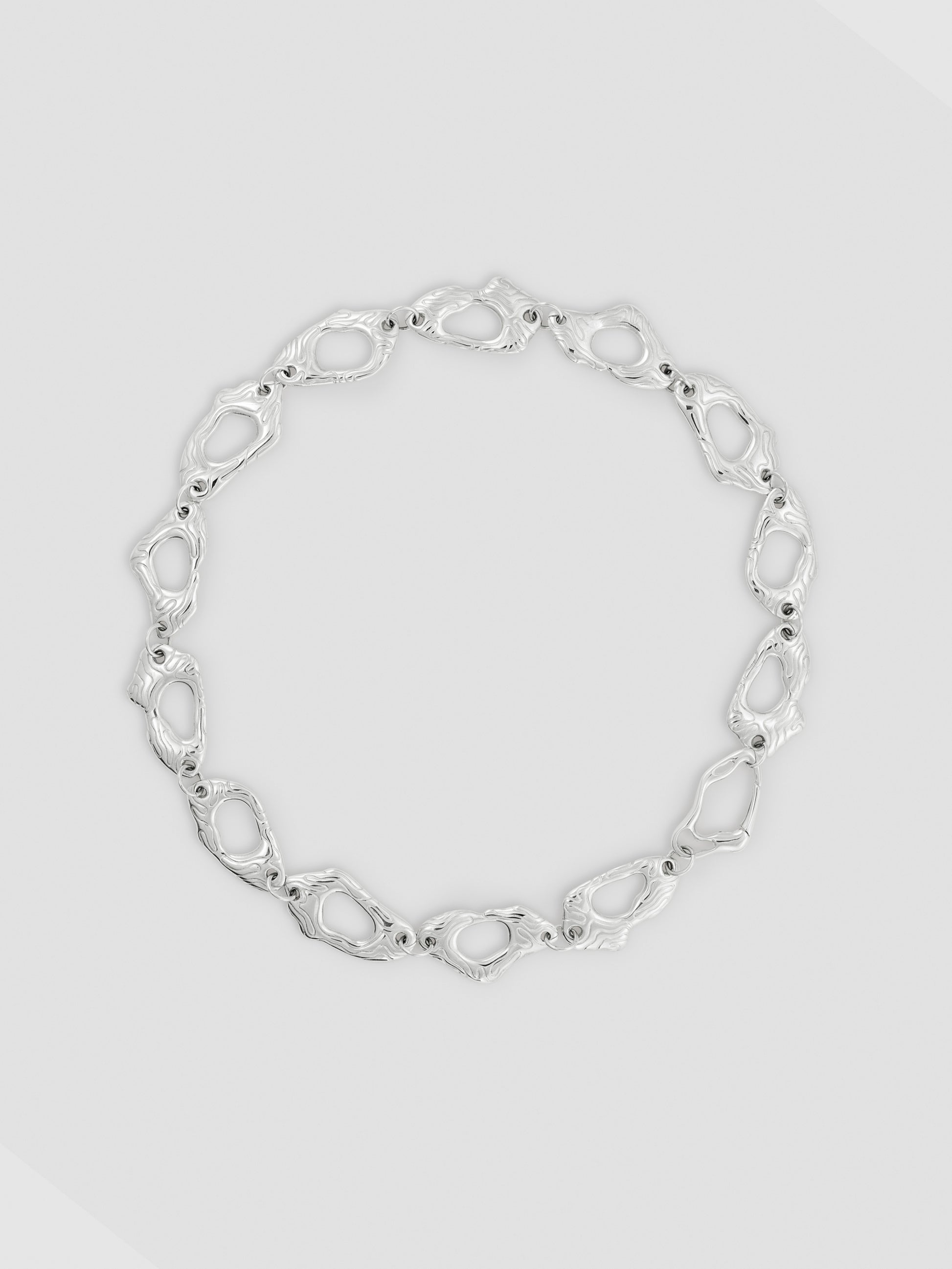 the island chain is a necklace made from links covered with hand drawn line work, influenced by nature's irregular patterns and textures. it is clasped with a mini octi clip and each link has a negative space.