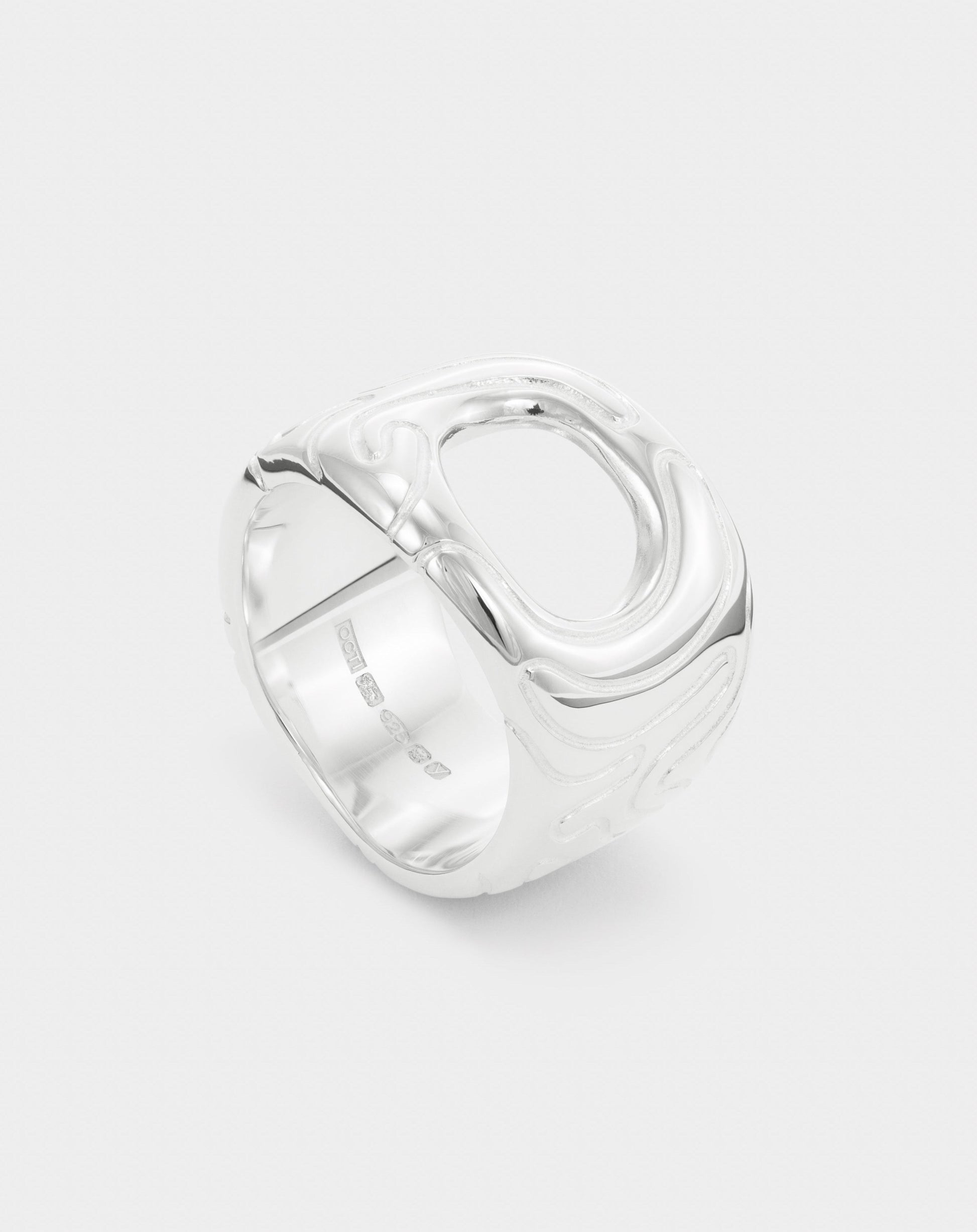 the globe ring is a band with an area of negative space. it is covered with hand drawn line work, influenced by nature's irregular patterns and textures. it has been designed and made in London, and comes stamped with full british hallmarking.