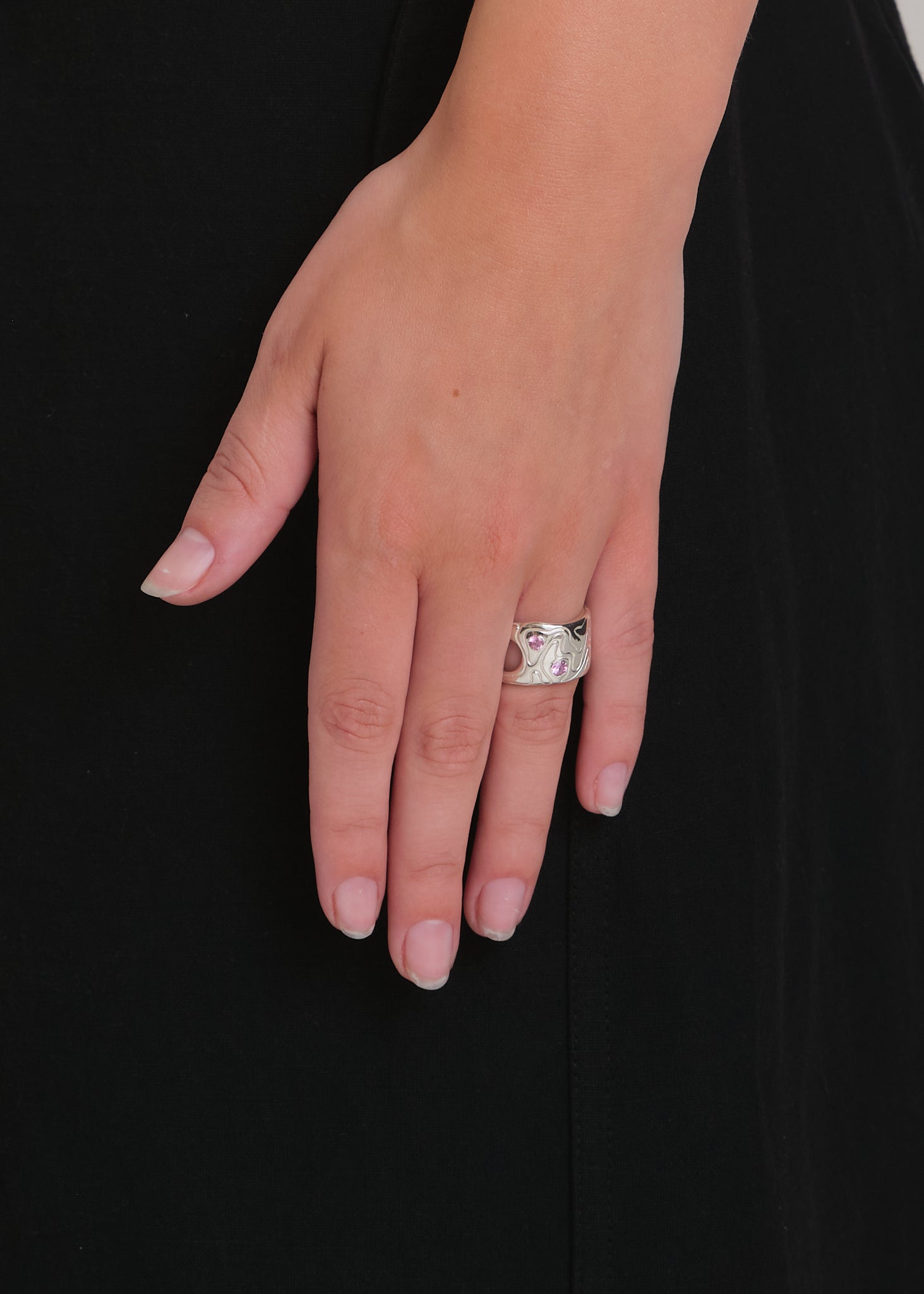 the globe ring is a band with an area of negative space and 2 sapphires. it is covered with hand drawn line work, influenced by nature's irregular patterns and textures. it has been designed and made in London, and comes stamped with full british hallmarking.