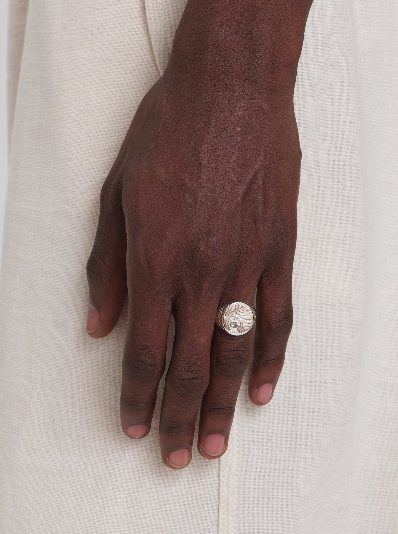 the globe signet is a round faced signet with one 3mm sapphire, covered in hand drawn line work, influenced by nature's irregular patterns and textures. it has been designed and made in London, and comes stamped with full british hallmarking.