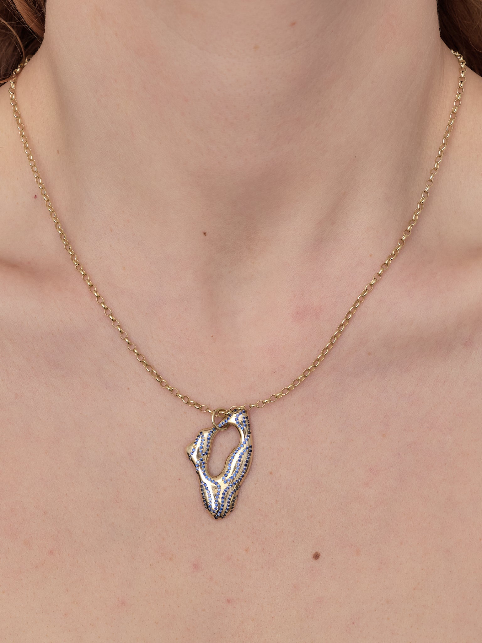 Sapphires follow a pattern that reflects parts of the natural world including, water, wood grain and rock formations - illustrating the connection between these elements, and inviting the wearer to become part of this collective connection.